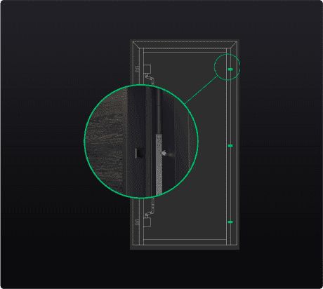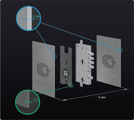 Толщина наружного стального листа составляет 2 мм. Толщина монтажного кармана, в который устанавливается замок, также составляет 2 мм. Бронепластина имеет толщину стали 1 мм. Таким образом, получаем суммарную толщину листа 5 мм, что позволяет надежно обезопасить зону запорных механизмов двери.